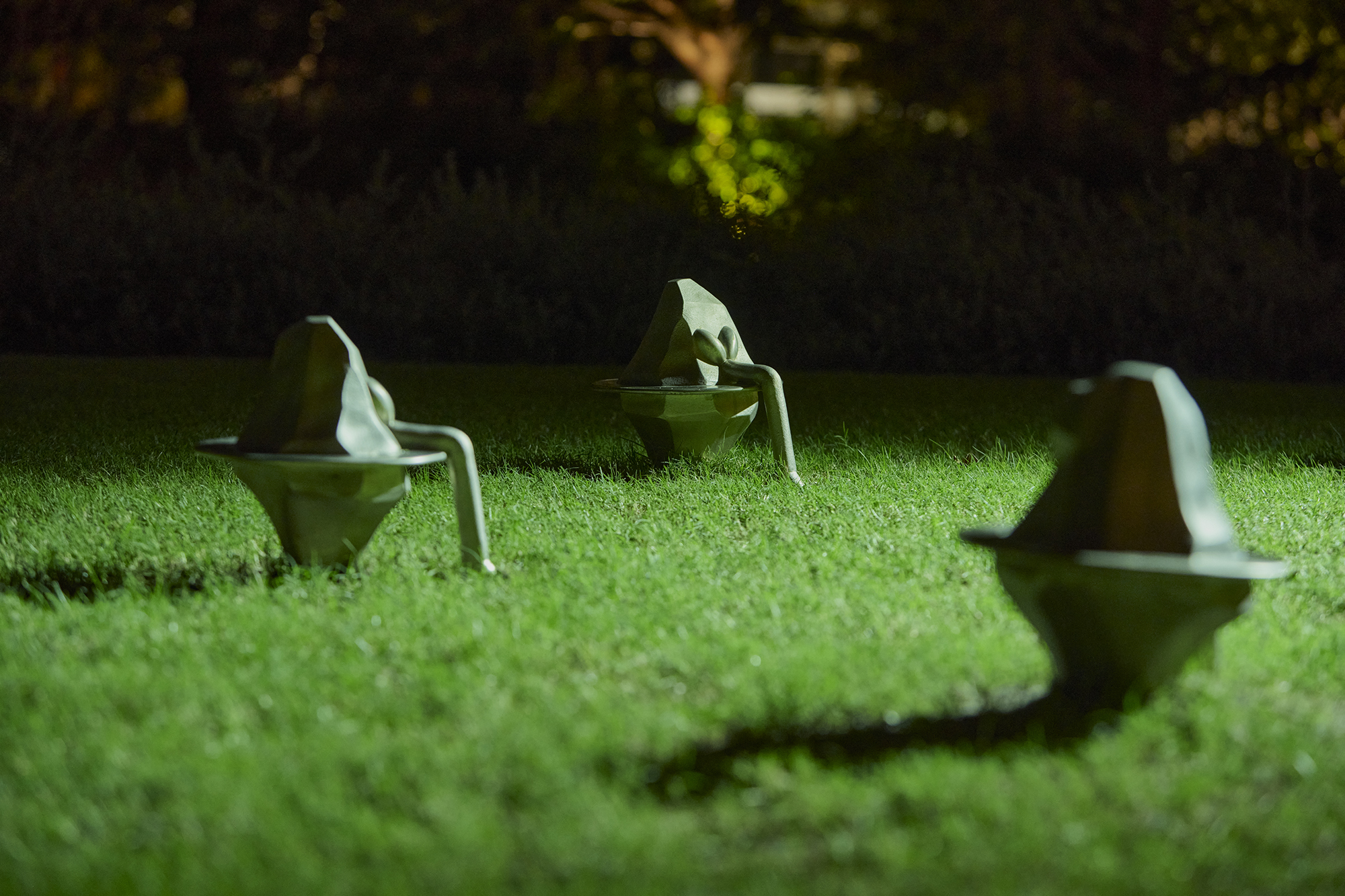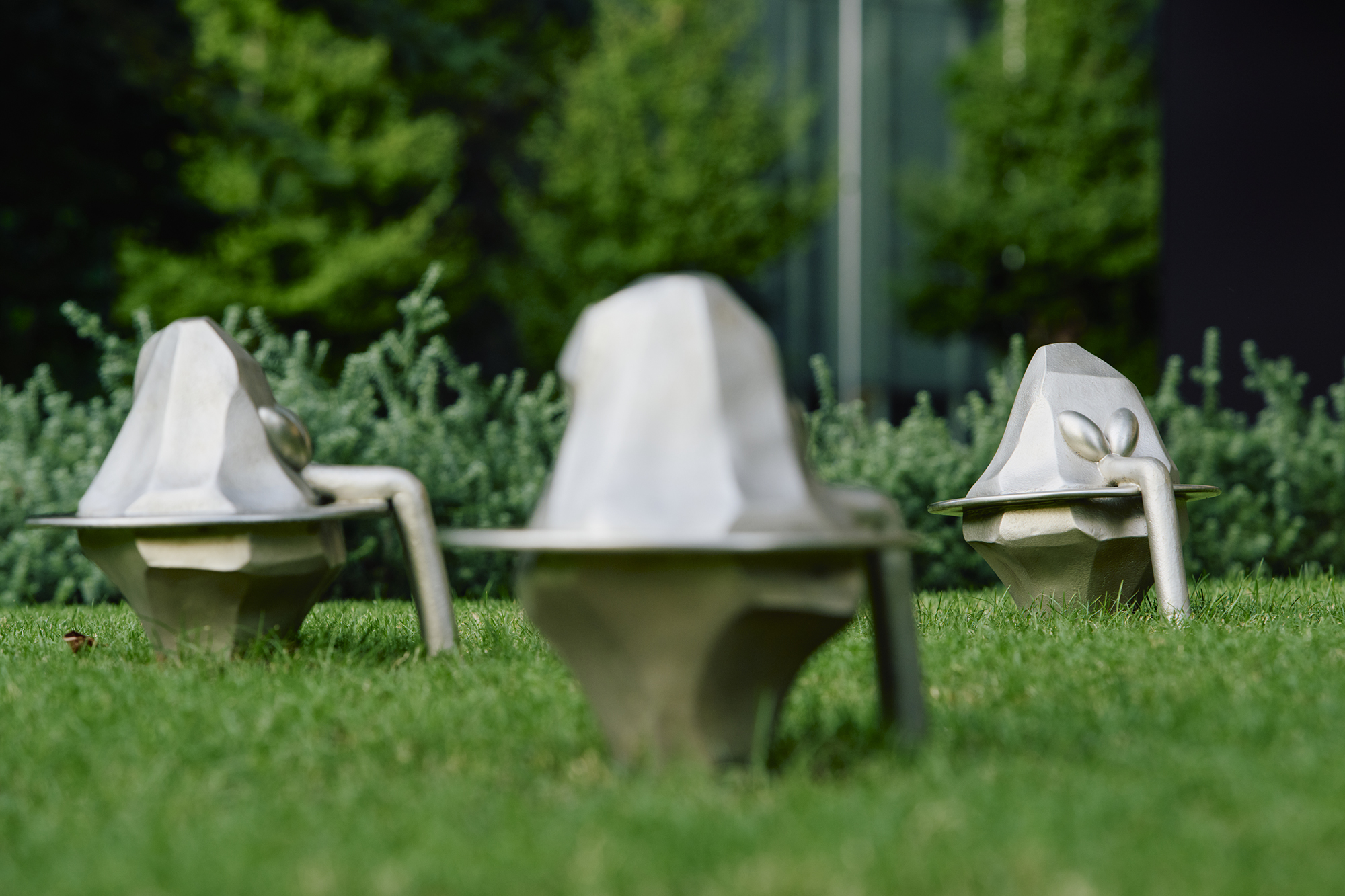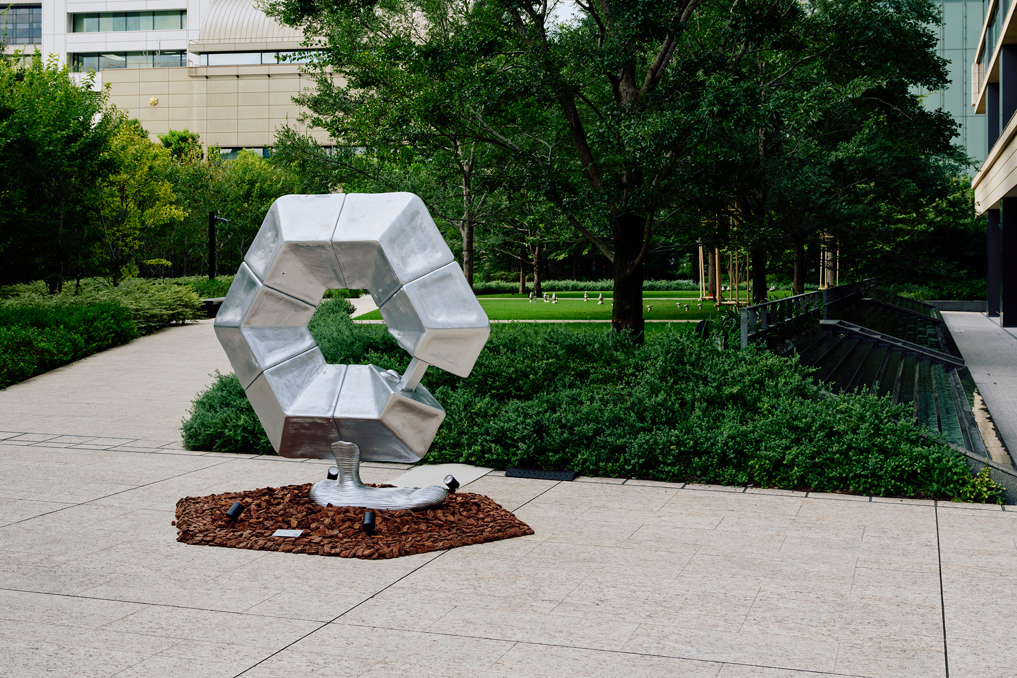 会場となったOtemachi One Gardenの芝生エリアには、銀色に輝く大きな輪状のオブジェと、円を描くように配置された複数の彫刻作品が出現。都市の中心におけるアートと自然、そして人々の新たな関係性を提案するインスタレーションとして注目を集めました。
